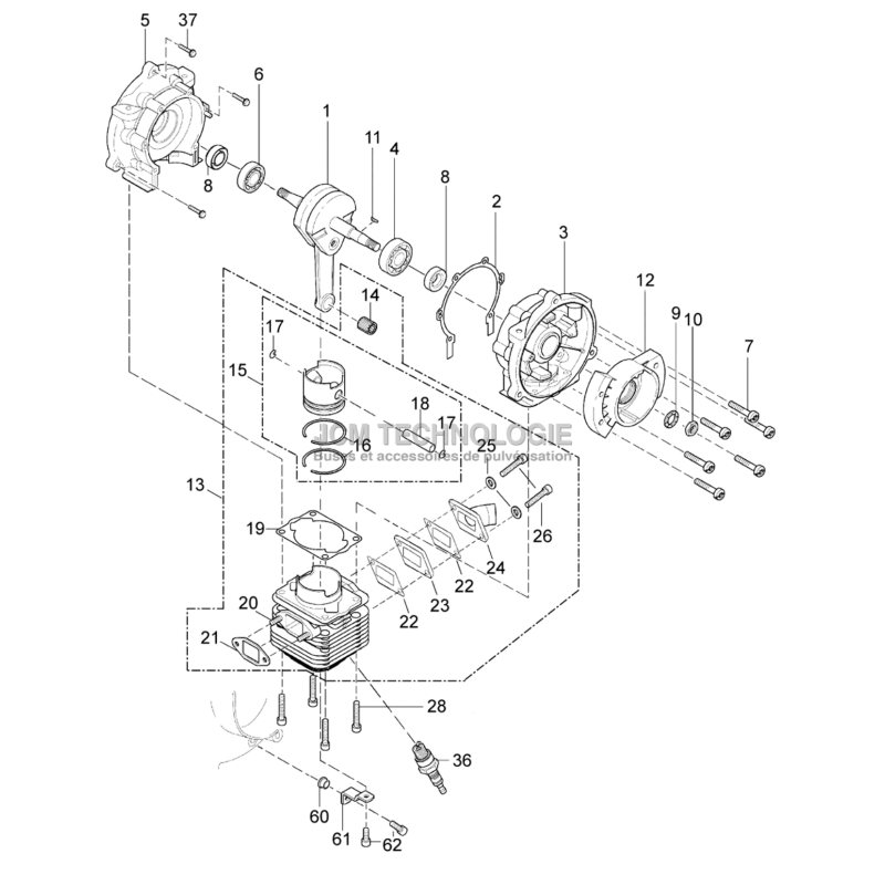 Vue éclatée du vilebrequin, cilyndre et piston de l'atomiseur solo 423